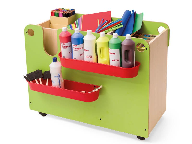 A mobile cabinet for storing and keeping in order various art materials on shelves or in all-purpose trays.
